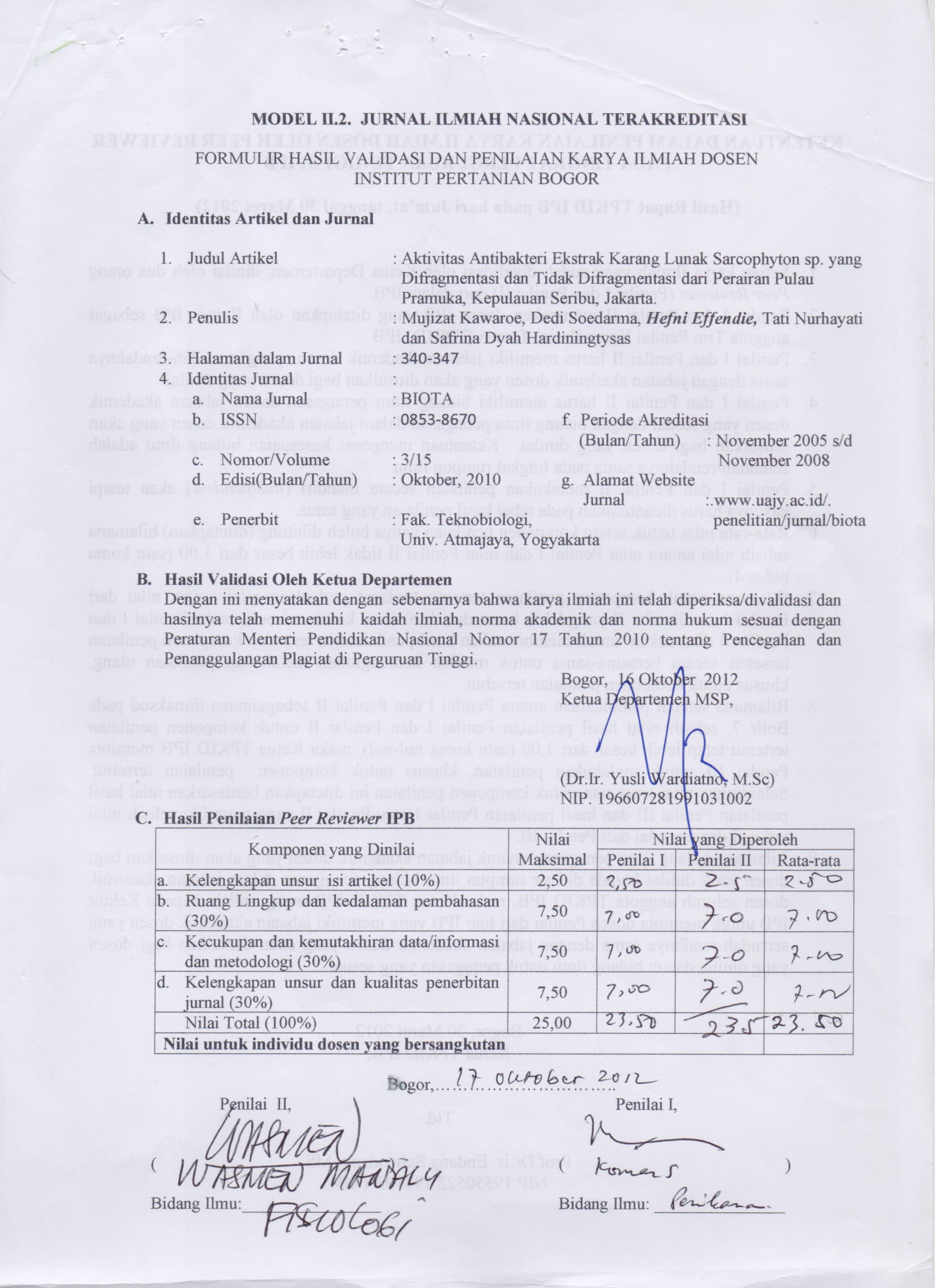 Formulir Hasil Validasi (Aktivitas Antibakteri Ekstrak Karang Lunak Sarcopython sp yang Difragmentasi dan tidak Difragmentasi dari Perairan Pulau Pramuka ,Kepulauan Seribu , Jakarta)
