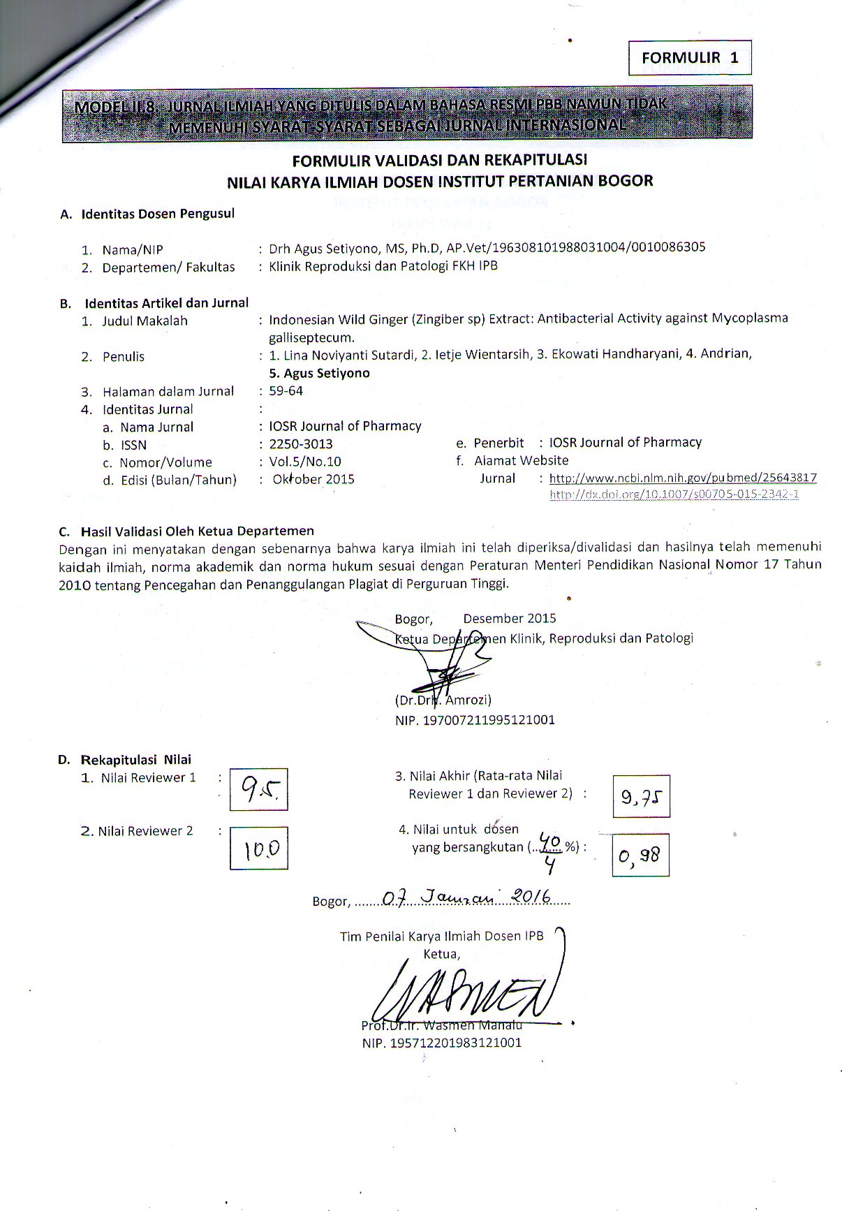 | Authors: | Lina Noviyanti Sutardi, Ietje Wientarsih, Ekowati Handharyani, Andrian, Agus Setiyono; Indonesian Wild Ginger (Zingiber sp) Extract: Antibacterial Activity against Mycoplasma galliseptecum. ; IOSR Journal of Pharmacy; No.ISSN: 2250-3013; 2319-4219; Vol.5; No.10; Oktober; 2015; Hal.59-64 |