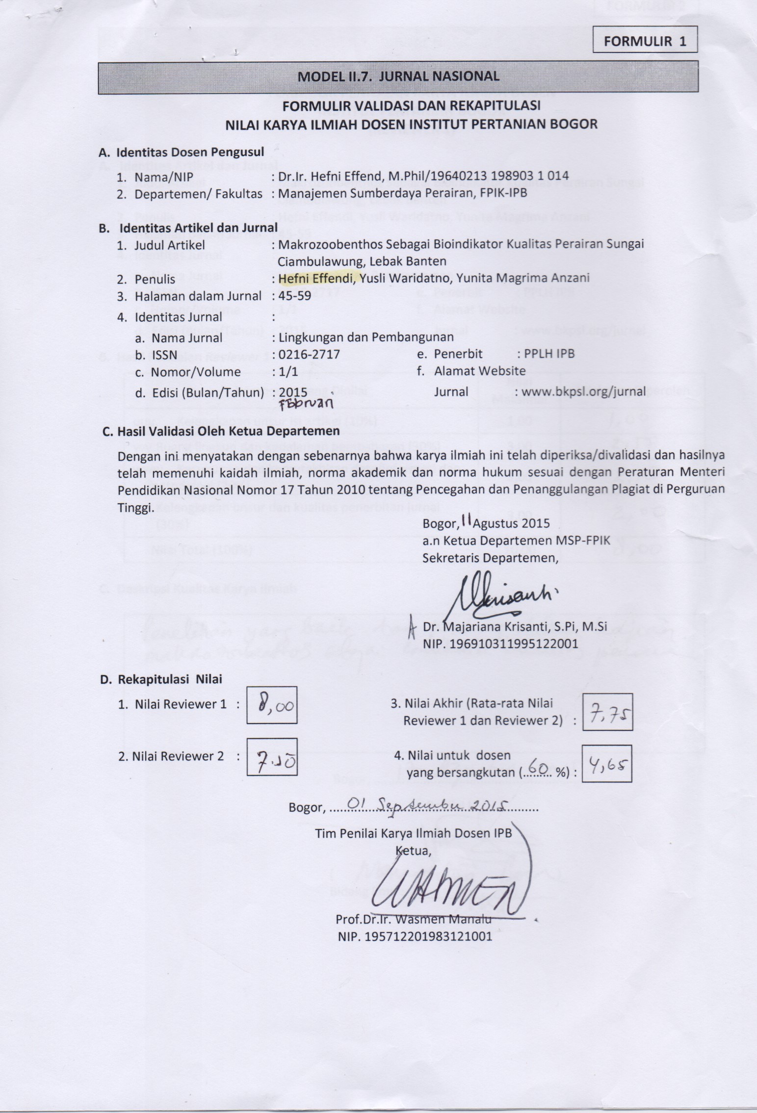 | Authors: | Effendi, Hefni Wardiatno, Yusli Magrima Anzani, Yunita |