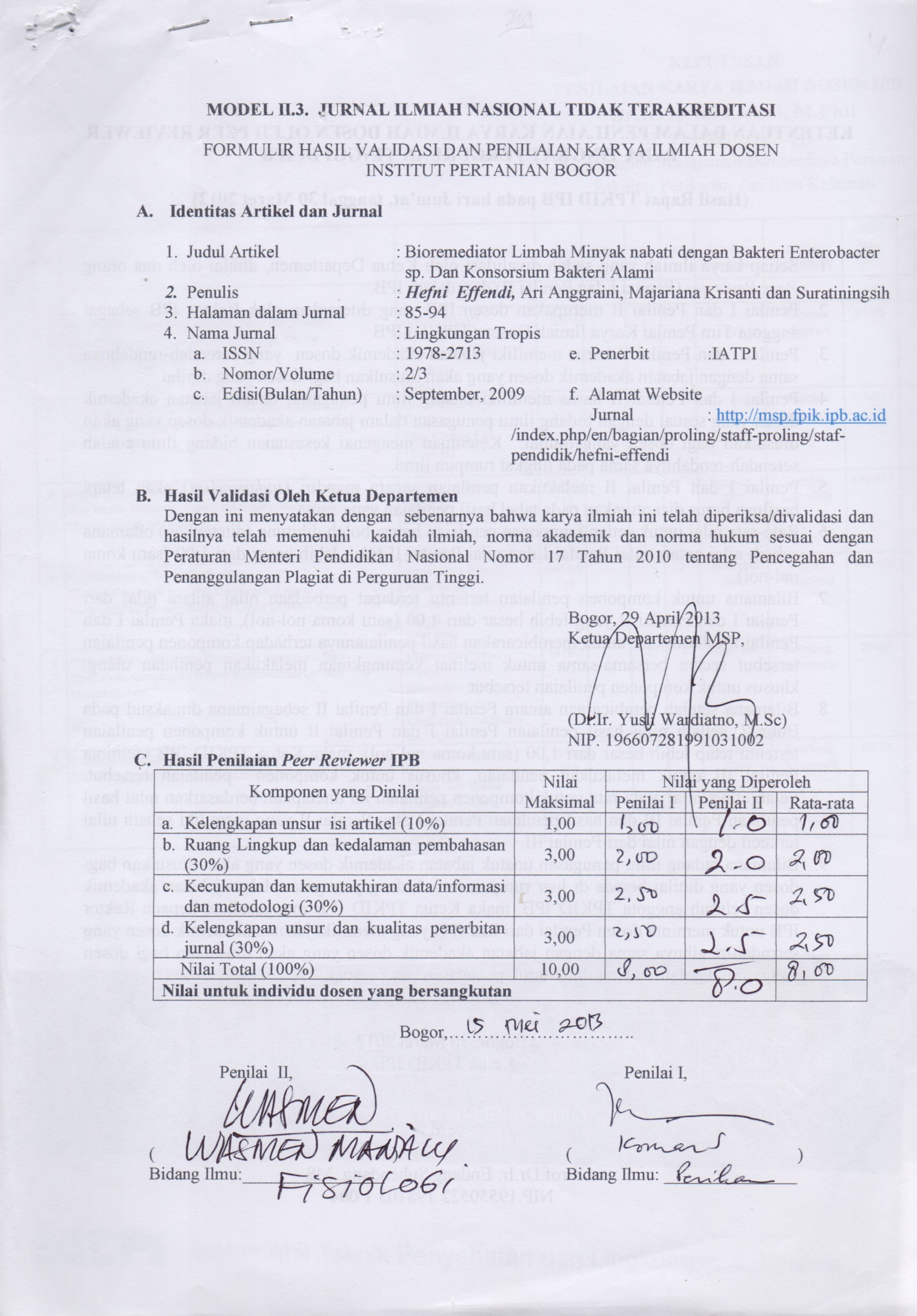 http://repository.ipb.ac.id/handle/123456789/80017| Title: | Formulir Hasil Validasi (Bioremediator Limbah Minyak Nabati dengan Bakteri Enterobacter sp. Dan Konsorsium Bakteri Alami |