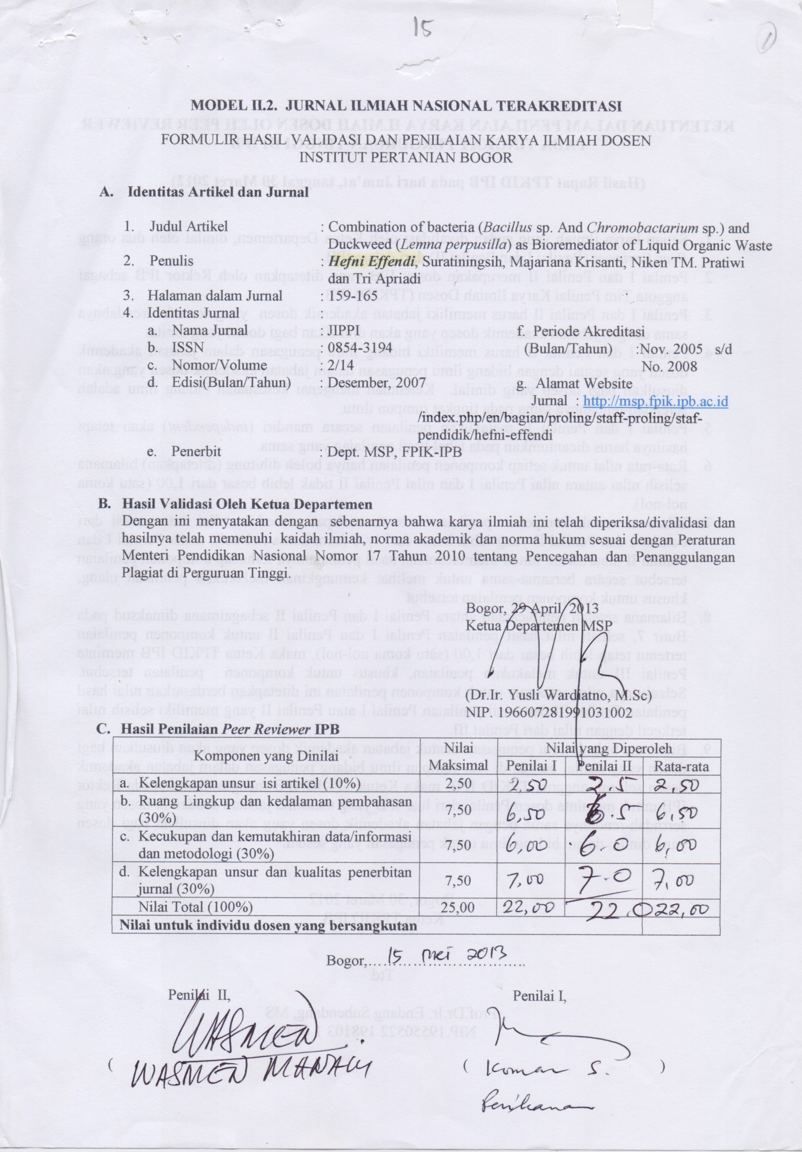 http://repository.ipb.ac.id/handle/123456789/80163| Title: | Formulir Hasil Validasi (Combination of bacteria (Bacillus sp. and chromobactarium sp.) and Duckweed (Lemna perpusilla) as Bioremediator of Liquid Organic Waste) |