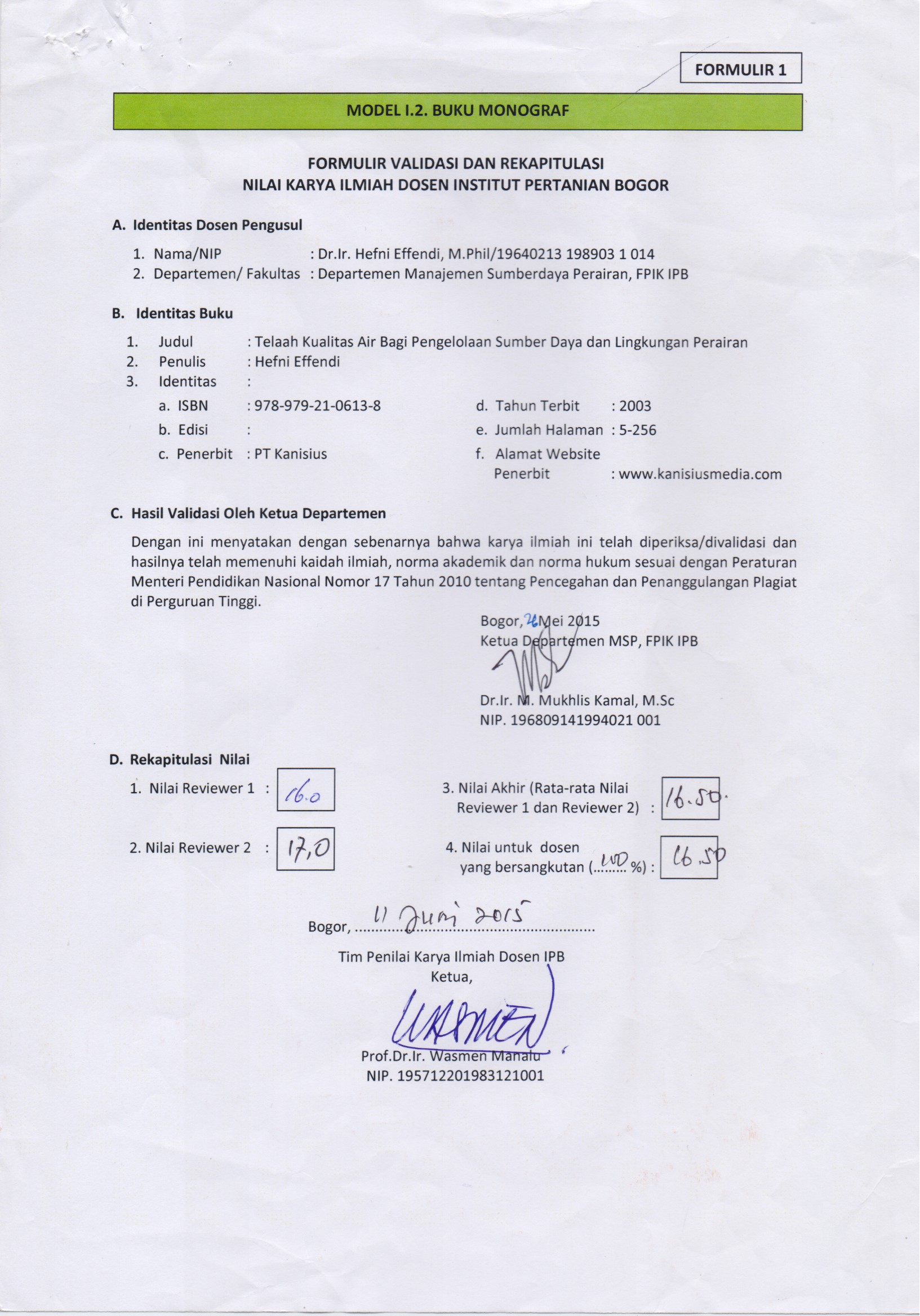 http://repository.ipb.ac.id/handle/123456789/80186| Title: | Formulir Hasil Validasi (Telaah Kualitas Air Bagi Pengelolaan Sumberdaya dan Lingkungan Perairan) |